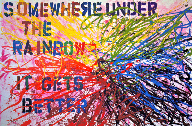 I’m also donating a painting for a silent auction fundraiser … bids will be accepted at the Celebration on the Square as well as at Sunday evening’s All Bodies Pool Party at Fred Broadstock Pool. The painting, ‘Somewhere Under The Rainbow It Gets Better’ (acrylic on canvas, 40×60) is one of two panels I created for last year’s Exposure Arty Carnival at the Jubilee.